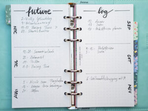 Die Kalender-Einlagen von Filofax eignen sich super, um sie mit dem future log zu kombinieren. Dank des Ringbuch-Designs kannst du einzelne Seiten jederzeit herausnehmen, umsortieren oder ergänzen – perfekt, wenn du dein Bullet Journal dynamisch und flexibel halten möchtest!