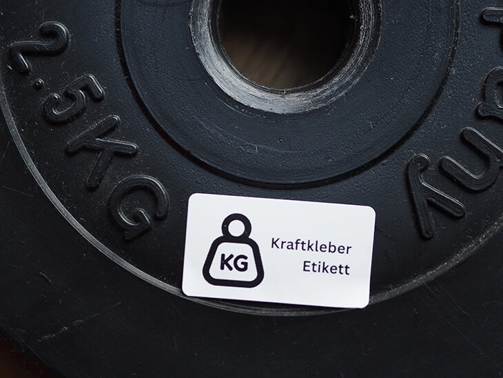 Ein Kraftkleber-Etikett von Avery Zweckform haftet auf einem 2,5kg Gewichtsring.