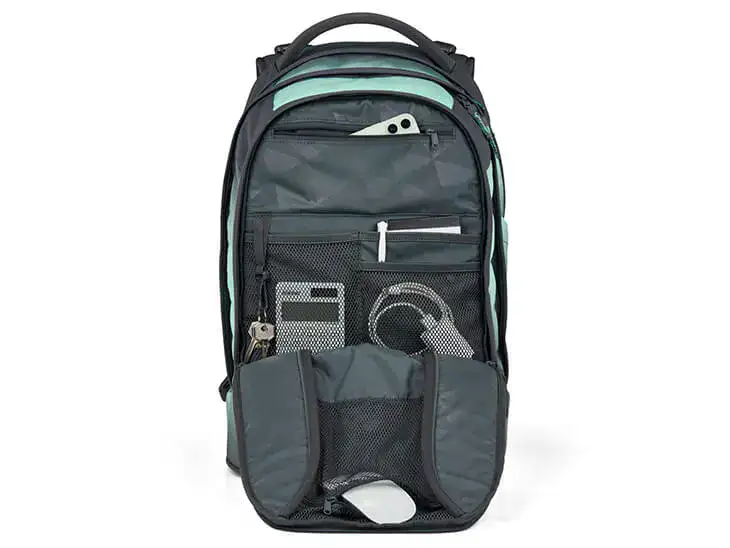 • Der Rucksack schließt mit den Schultern ab und endet oberhalb des Beckens